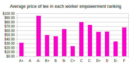 In fact, cheaper than the median shirts (less than $40) had an average worker empowerment rank of 3.19 when the letter scores are converted to numbers (slightly above a D+).